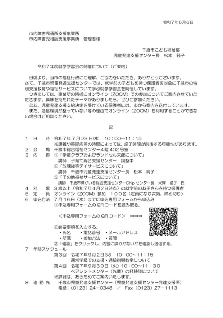 千歳市児童発達支援センター主催の就学学習会≪第2回≫のご案内