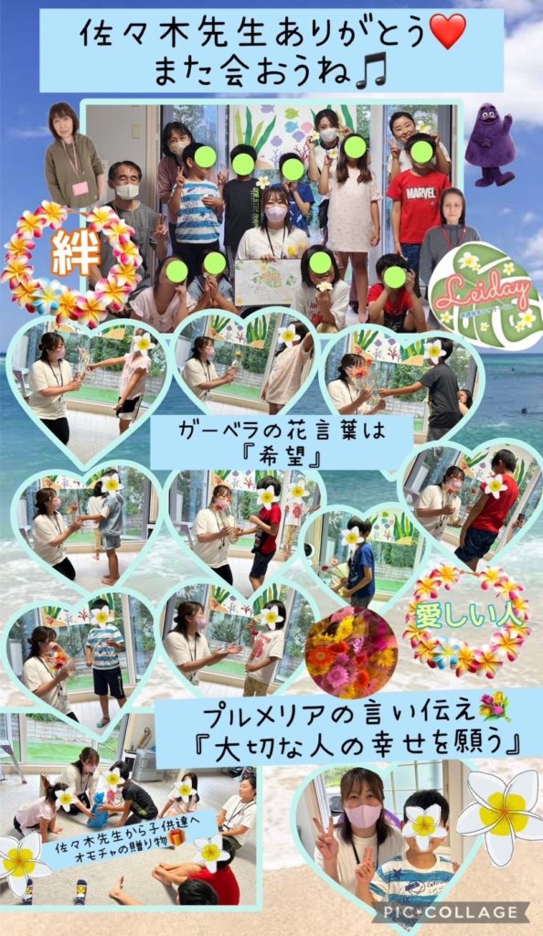 『レイデイ』避難訓練&お別れ会 未分類 2024.08.30 今日でお別れする佐々木先生のお別れ会をしました。 子供たちからお花のプレゼント🌼 佐々木先生からはみんなへジェンガをいただきました✨ みんな佐々木先生への「ありがとう」の気持ちを伝える事が出来ました。 いつでも遊びに来て下さい✨ みんなで待っています!