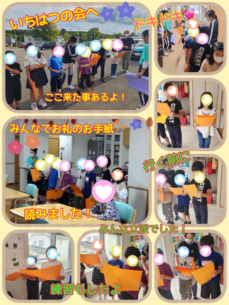 『レイデイ』いちはつの会へ 未分類 2024.09.18 先月行なったハッピーフェスタのお礼に今日はいちはつの会へ伺いました。 お礼のお手紙をみんなで読んでプレゼントも渡して来ました。 緊張しながらもみんなとっても立派でした!