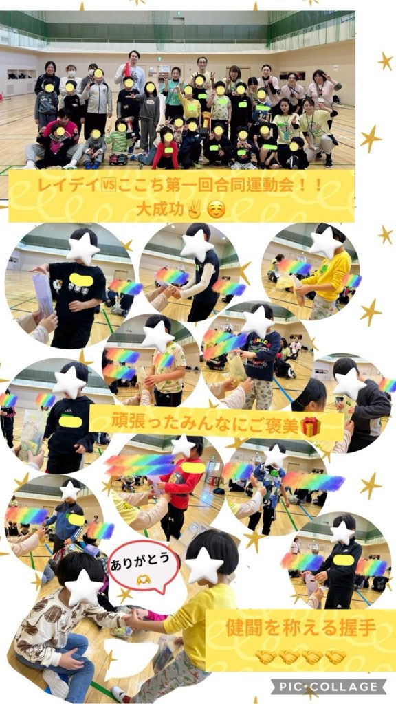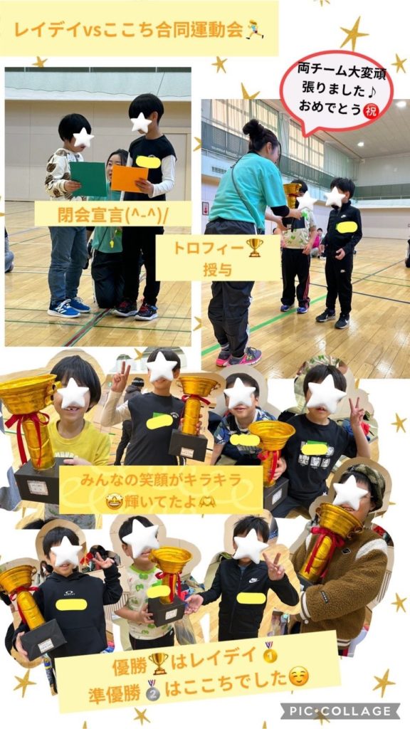 『レイデイ』ここち&レイデイ合同運動会🎌🏃💨 未分類 2025.01.19 初めての試みとしここちさんと合同運動会を行ないました! 初めて会うお友達、先生に少し緊張しながらもみんな一生懸命最後まで頑張りました✨ 結果はレイデイが優勝し優勝カップ🏆を頂きみんな笑顔でした😊 最後はみんなで写真をとりここちさんのお友達と握手をして終わりとなりました🤝 たくさんの父兄の方々に応援して頂きありがとうございます🙇♀️ ここちさんのお友達、先生ありがとうございました✨