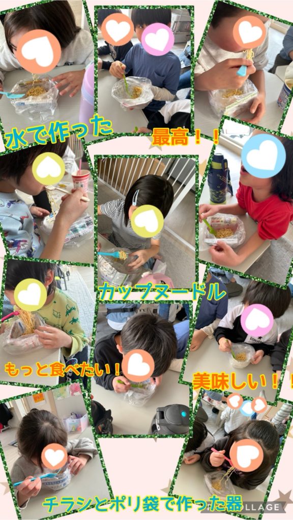 水の入ったペットボトルを懐中電灯の上に乗せ手作りランタンの明るさを確認したりお水からカップヌードルを作りお皿が割れて入れ物が無い時の為にチラシとビニール袋で手作りの器を作りその中にカップヌードルを入れて食べてみました。