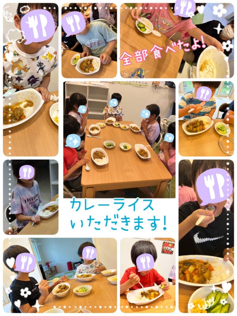 《その写真は秘密㊙️なので載せません》 そしてその後はお腹も空いてきた頃🤪🤪🤪デイジーファームで収穫したじゃがいも🥔がたっぷり入ったカレーライス🍛ときゅうり🥒とトマト🍅も収穫しコーン🌽も入れてサラダも食べました‼︎きゅうりを食べた子どもから「今まで食べたきゅうりの中で1番美味しいよ!!」と最高のお言葉頂き🌟 夏カレーになるよう🍆を入れてみると「生まれて初めて食べれたよ‼︎」と自信たっぷりの表情を見せてくれていたのも印象的でした‼️ どのお友達もカレーライスをすごいスピードで完食していました(´∀`*)私達も食べましたがとっても美味しかったです♪
